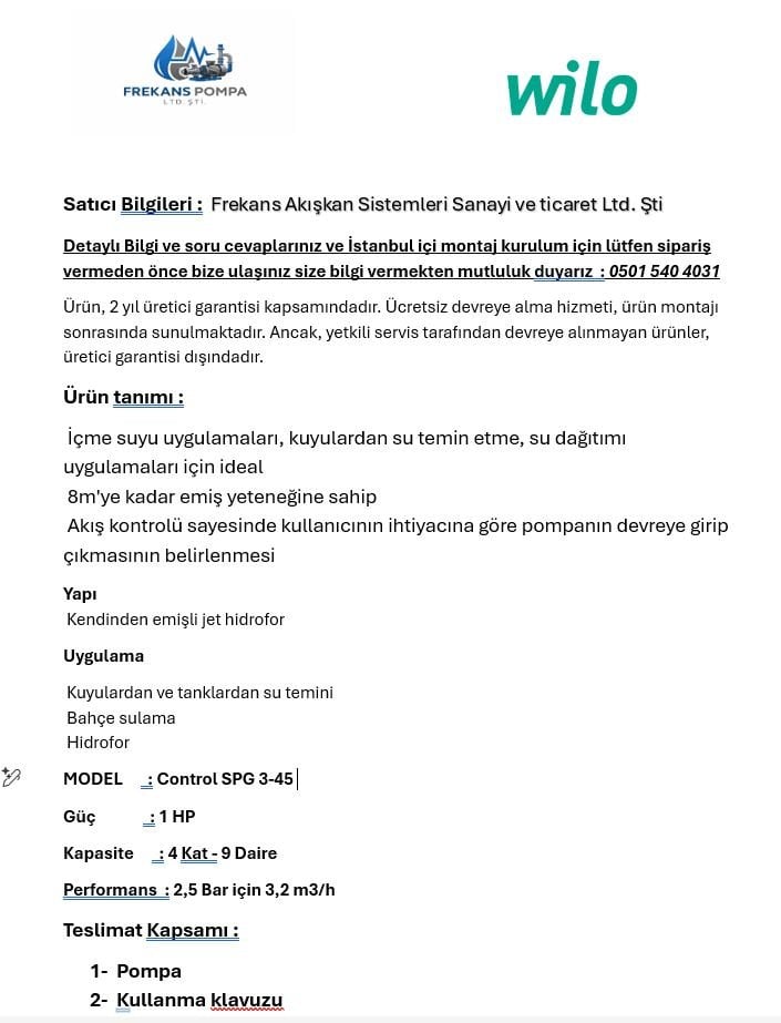 WILO Control SPG 3-45 Fluid Kont. Hidrofor 4 Kat-9 Daire