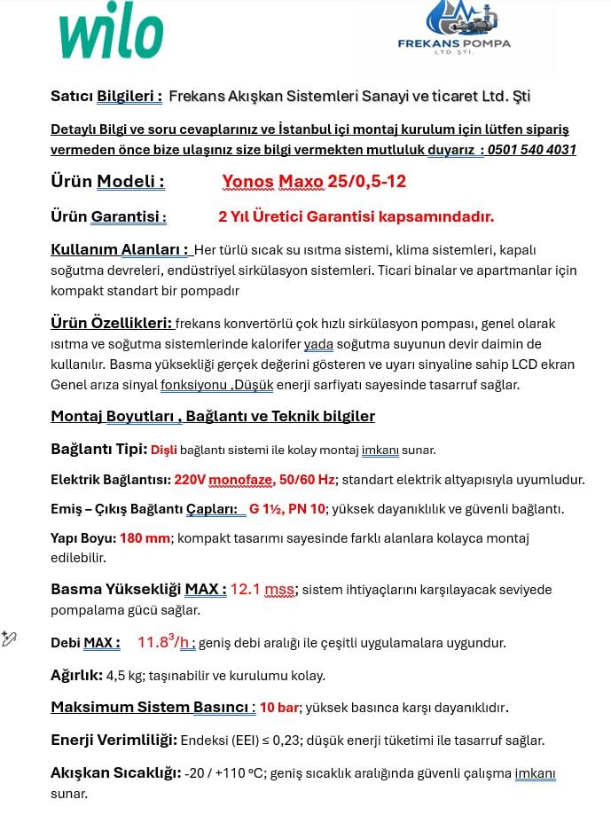 WILO YONOS MAXO 25/0,5-12 FREKANS KONVERTÖRLÜ SIRKÜLASYON POMPASI