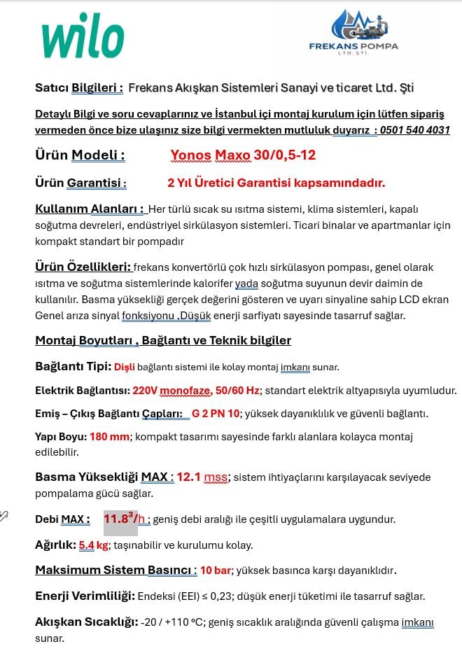 WILO YONOS MAXO 30/0,5-12 FREKANS KONVERTÖRLÜ SIRKÜLASYON POMPASI