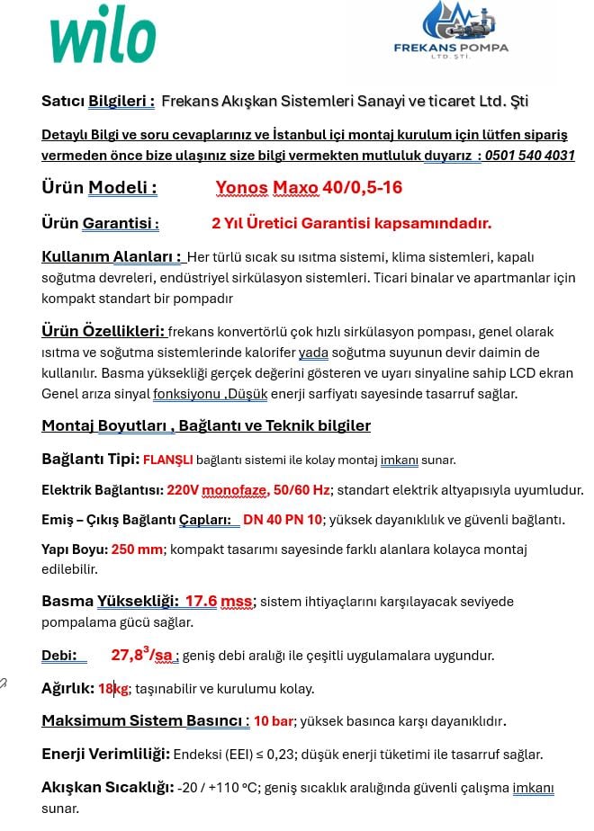WILO YONOS MAXO 40/0,5-16 FREKANS KONVERTÖRLÜ SIRKÜLASYON POMPASI