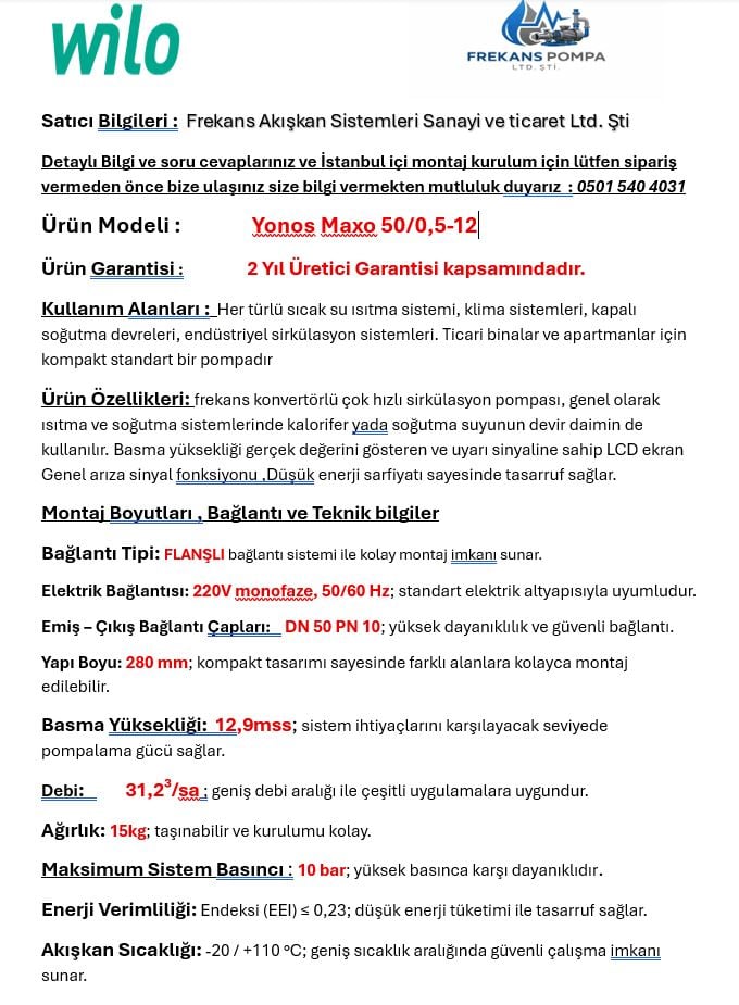 WILO YONOS MAXO 50/0,5-12 FREKANS KONVERTÖRLÜ SIRKÜLASYON POMPASI