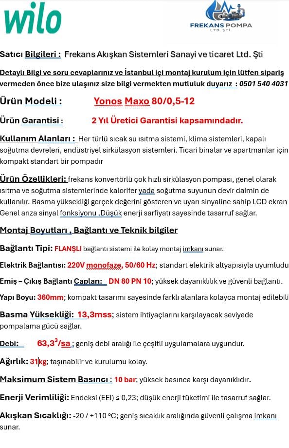 WILO YONOS MAXO 80/0,5-12 FREKANS KONVERTÖRLÜ SIRKÜLASYON POMPASI